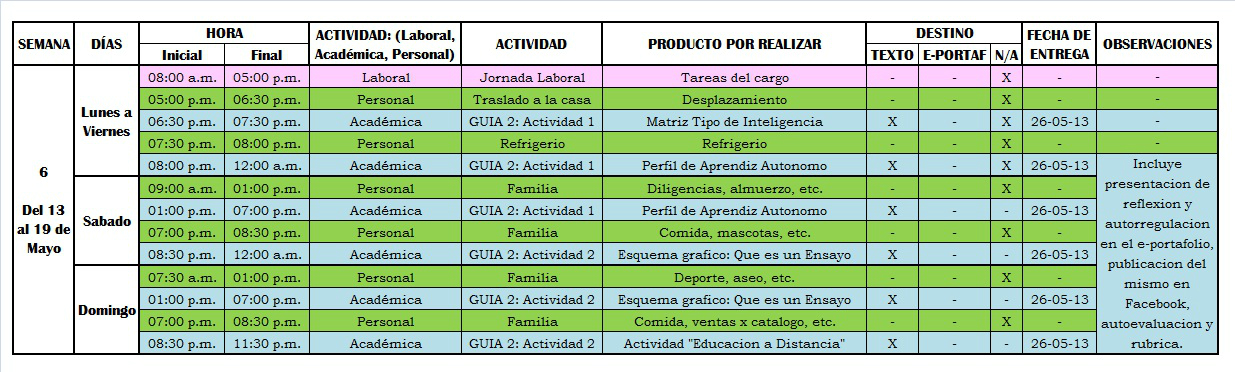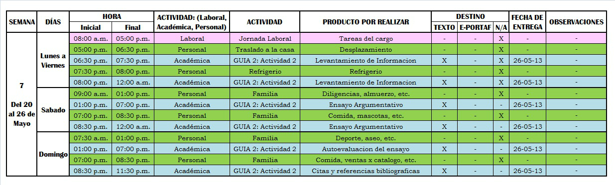 En mi cronograma pueden ver como organice mi tiempo para realizar las actividades de la Guia 2... Dedicando tiempo para mi familia, mis actividades personales y teniendo en cuenta mi horario laboral...